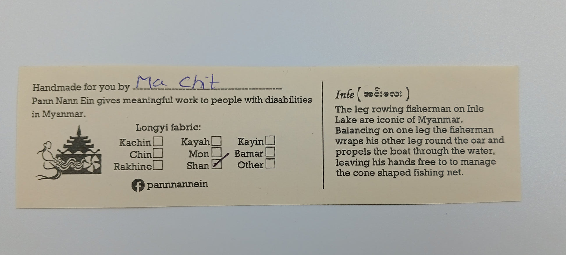 The inclusion of the artisan's name in the card reminds us how this product is providing work for people with disabilities.