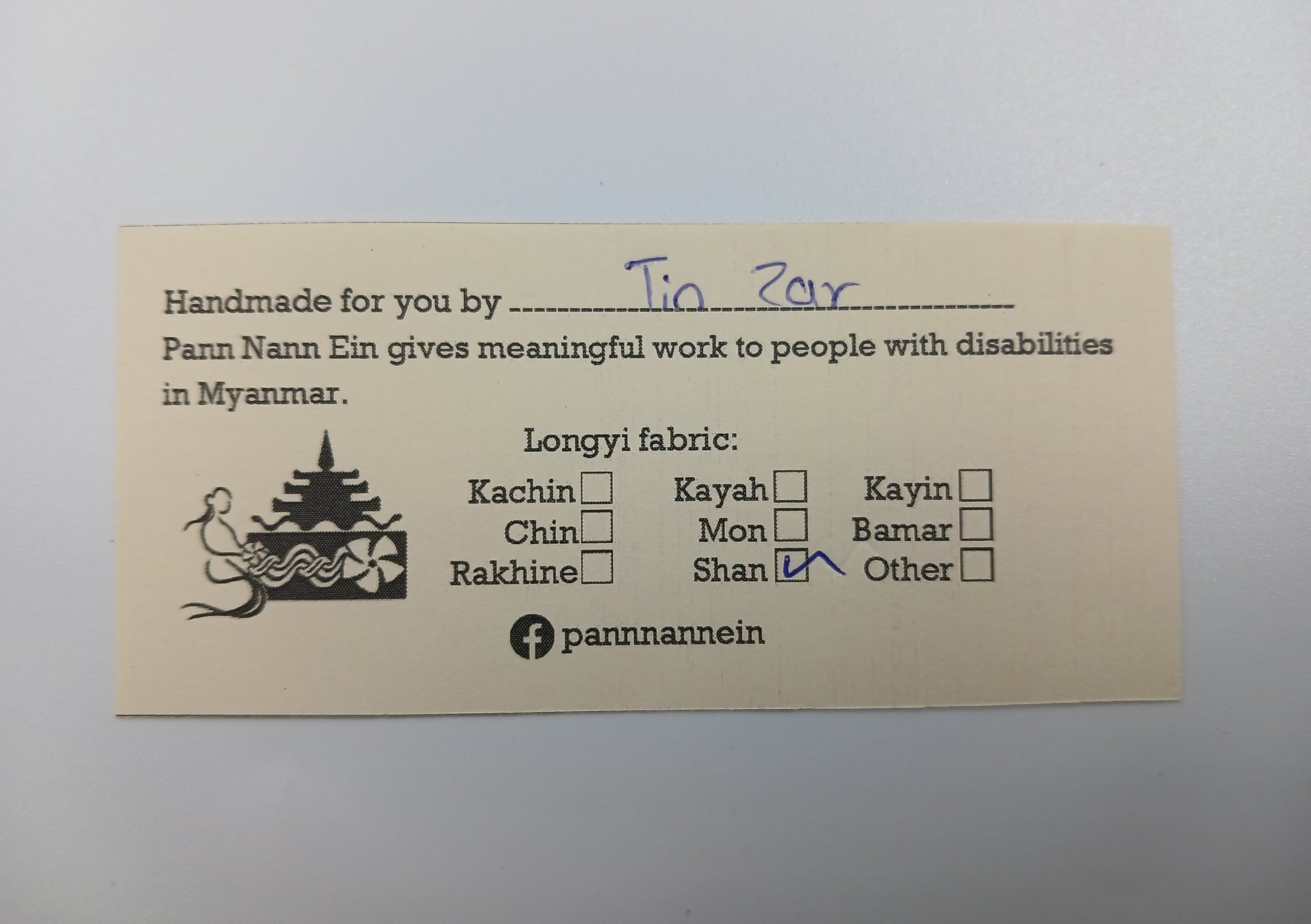 The inclusion of the artisan's name in the card reminds us how this product is providing work for people with disabilities.